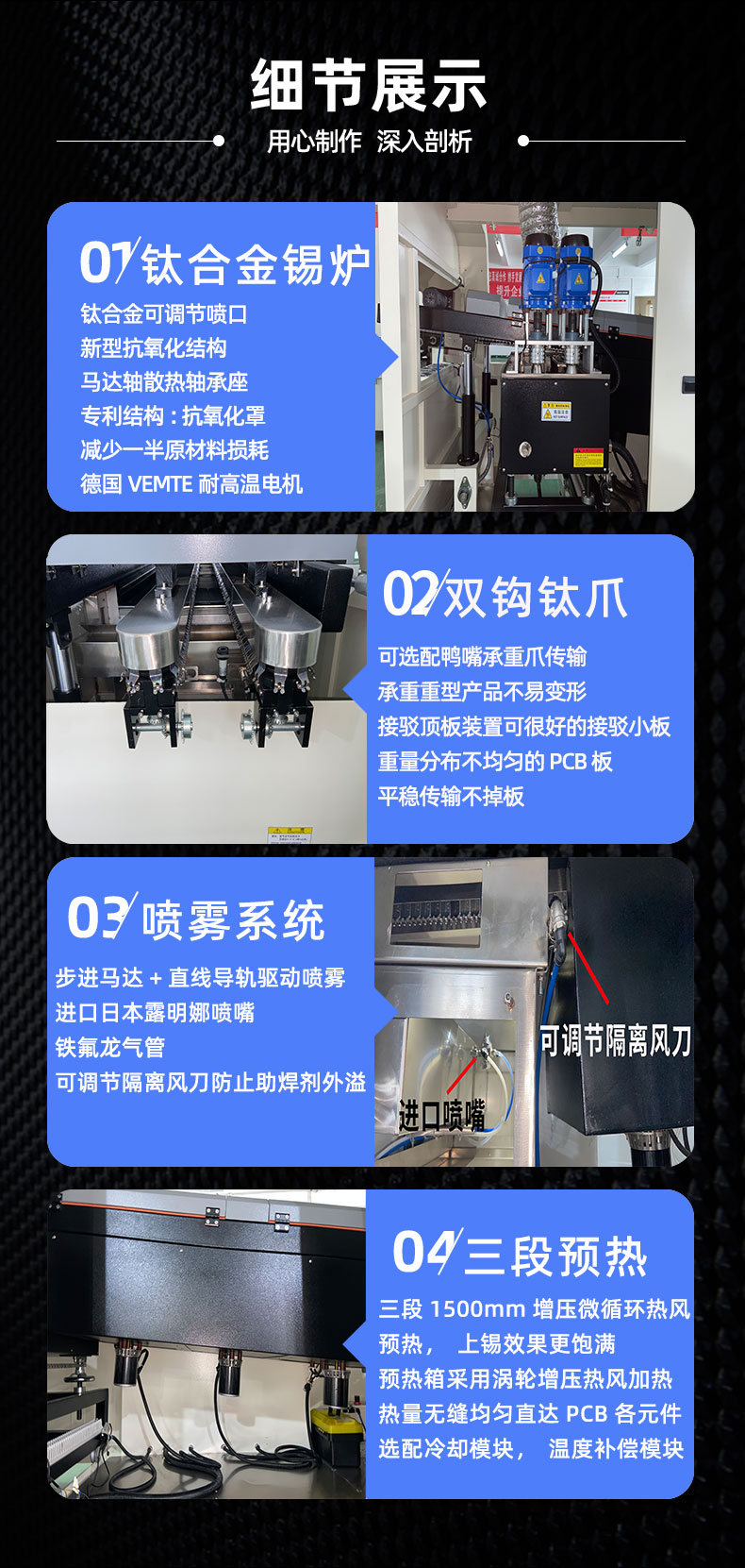 ● 三段式1.5米超长热风预热均匀迅速抬高PCB板温度,快卸直拉式设计,维护方便