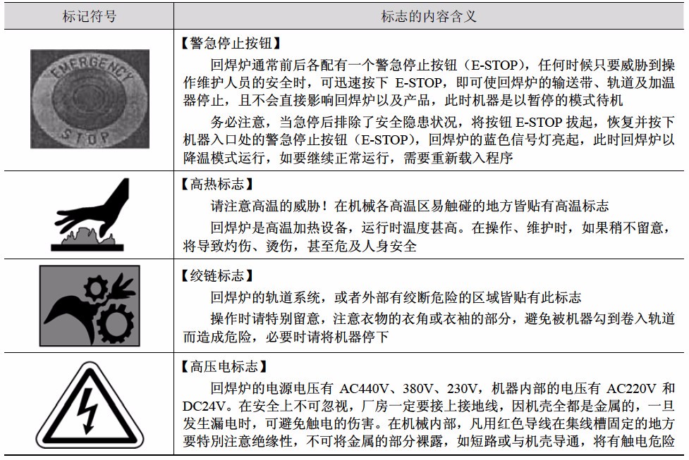 茄子黄色视频下载是 SMT 生产过程中的关键工序,焊接的质量直接影响电子产品的电气性能和连接的可靠性。准确、高效的维护操作,可有效地改善设备的缺陷,以获取最大的效益产出,有效地提高生产效率和生产质量。操作维护人员必须经过专业学习,持证上岗。为了人身和设备的安全,必须严格执行安全茄子APP污下载操作规程。其安全标志和安全信息见表1-2-7。