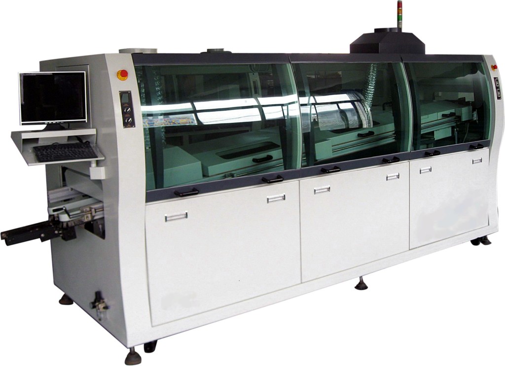 中型机的应用目标是批量生产单位和公司。其设计特点是:型号大,整体布局为机柜结构,总体波峰总宽300mm以上,钻料槽容量大于200kg(单波峰机)kg(双波峰机)kg,选择框架式或爪式直线夹送方式,功能齐全,夹送速度快,运行效率高,可供客户选择的配件多,与前后线体匹配性好。