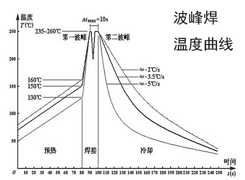 波峰焊预热温度为:80℃~150℃,预热时间为:40S-100S