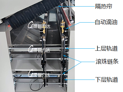 1 双层导轨结构,上下层闭环单独控制,上层报警不影响       2 采用进口飞利浦中波红外线灯管,配合镜面反射板,                           下层工作;                                                                              专利板面测温补偿模 式,实测温度精度高
