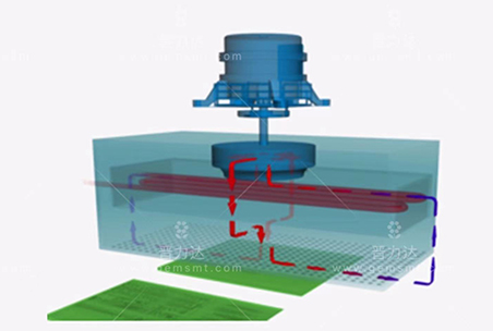 7、由于先进的孔喷嘴几何形状,出色的热传递以及加热模块中可监控的可调超压,保证均匀和无间隙的热传递到电路板。整个过程可以保证惰性工艺气氛焊接过程,因为是封闭的系统,没有外部空气进入处理室。 热流在系统内通过循环发生,即过程预热和峰值区域的气体被提取,清洗并从侧面重新插入过滤网。